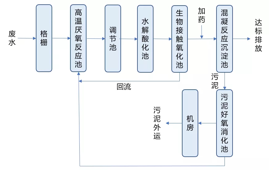 (3)調節池。廢水從高溫厭氧反應罐通過連接管流到調節罐。調節池主要用于調節水量和平衡水質,并確保考慮水質和流量的加工設備正常運行的必要結構。適當的調節量是確保水質和水質平衡的關鍵,也是確保后續結構正常運行的關鍵。