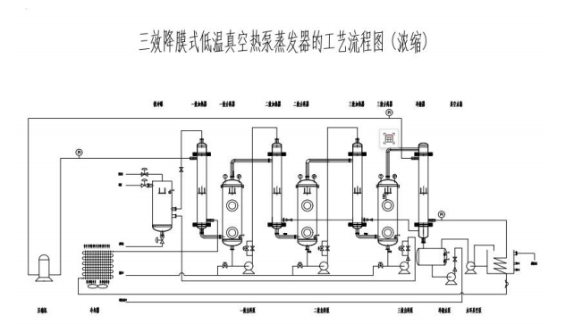 三效蒸發(fā)器是由相互串聯(lián)的三個蒸發(fā)器組成,低溫(90℃左右)加熱蒸氣被引入效,加熱其中的廢液,產(chǎn)生的蒸氣被引入第二效作為加熱蒸氣,使第二效的廢液以比效更低的溫度蒸發(fā),這個過程一直重復(fù)到一效。效凝水返回?zé)嵩刺帲渌餍畢R集后作為淡化水輸出,一份的蒸氣投入,可以蒸發(fā)出多倍的水出來。