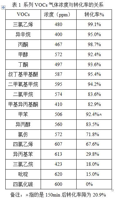 從表1VOCs濃度和轉(zhuǎn)化率數(shù)據(jù)可知:在相同測試條件下,在VOCs濃度400-600ppm區(qū)間內(nèi),大多數(shù)VOCs氣體具有較高轉(zhuǎn)化率。然而,光催化降解異丙基苯、三氯乙烷、吡啶和四氯化碳的效率是不明顯的。
